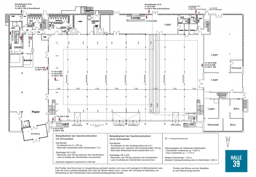 Für Veranstaltungen jeglicher Art stehen ansprechende Nebenräume bzw. Garderoben und Gastronomiemöglichkeiten bzw. Cateringbereiche bereit. Auch die vorhandene Haustechnik lässt keine Wünsche offen: Unser Technikpartner ist die Audio Werft Veranstaltungstechnik GmbH.